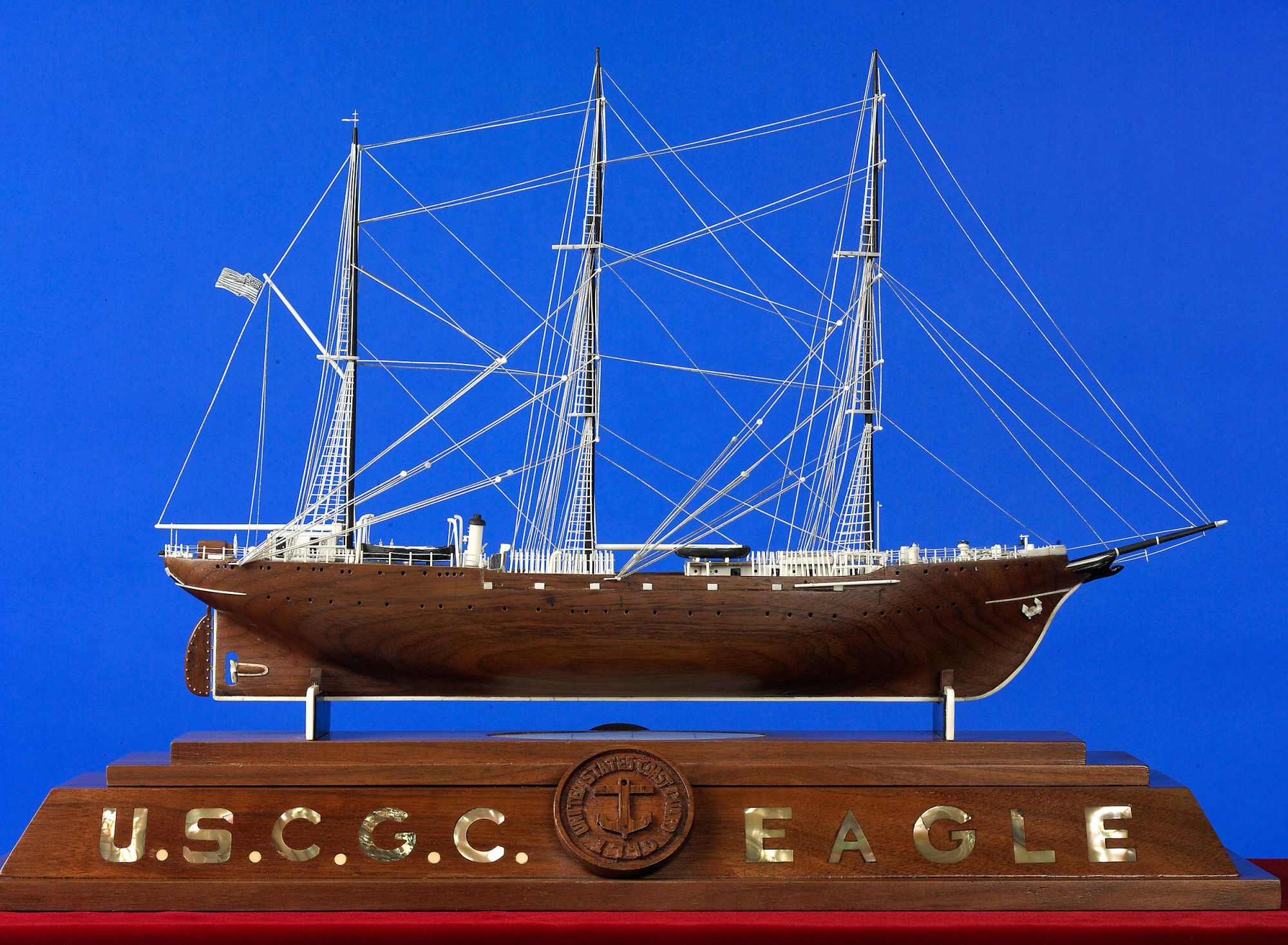 By age 17, David had mastered his special technique of making ivory rigging and was poised to create his first major carving. He had made scores of smaller ship carvings, but they lacked scale, accuracy and intricate parts. His first major carving took him over a year to complete and was a scale replica of the Coast Guard Training ship "Eagle" that still sails for the Coast Guard Academy. David was able to acquire blueprints and technical drawings of this three masted bark from the Academy. Many of the drawings were copies of the original German drafts from 1936 when it was originally built as a training ship for Germany's navy.