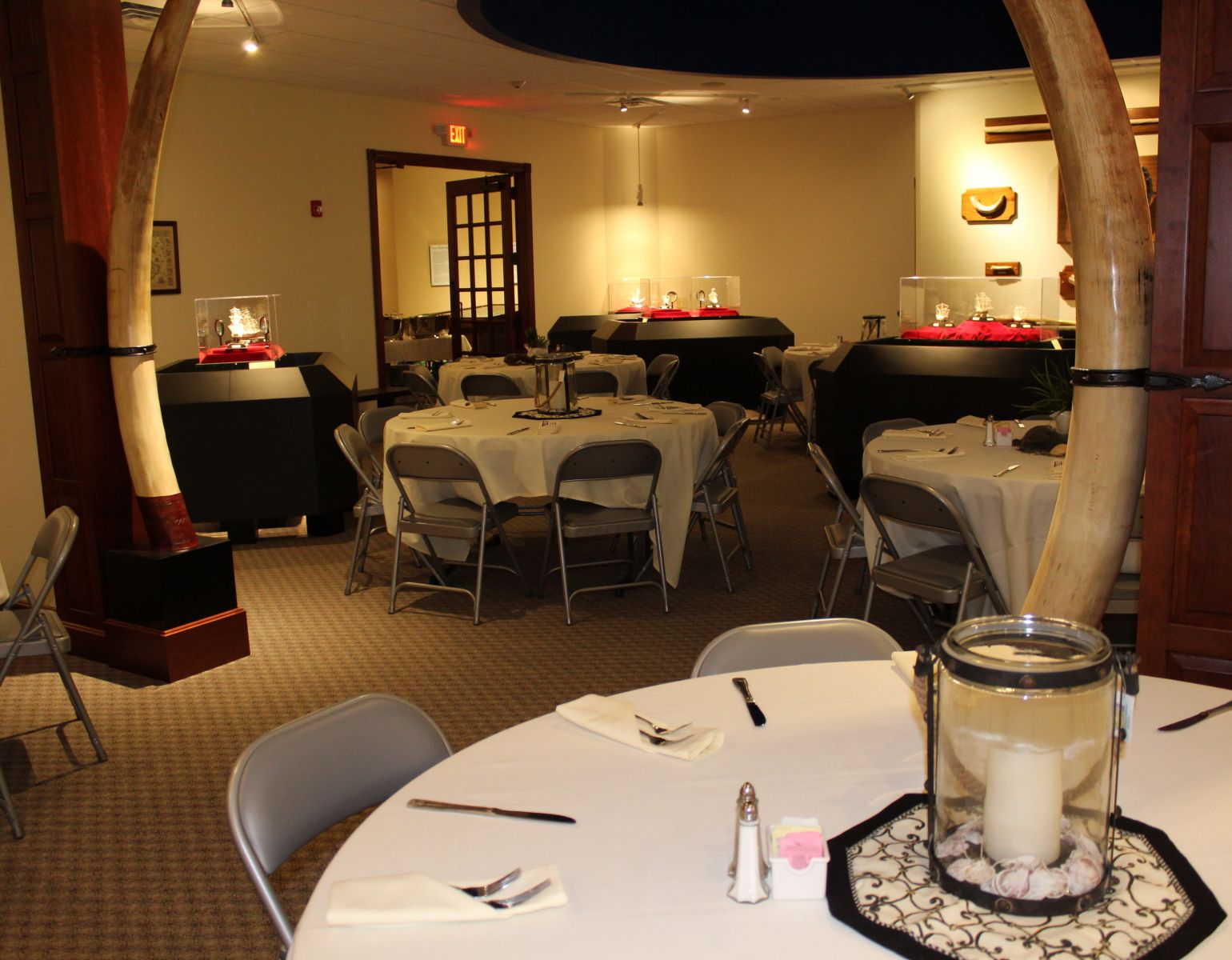 Halfway through the tour your group enters additional museum exhibit rooms that have been set up for an elegant candlelit dinner with linens, soft music and a delicious meal prepared by a well known area chef who is a fully-licensed caterer. The meal includes a plated entree, salad, dessert, and beverages.